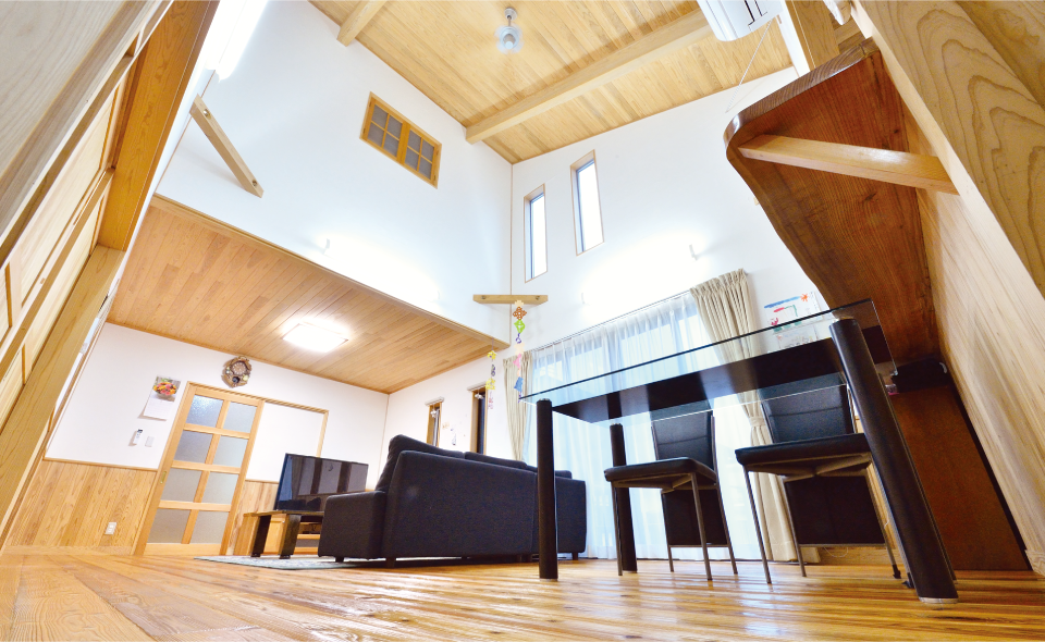 ソファーから見える先には吹き抜けと大きな梁、