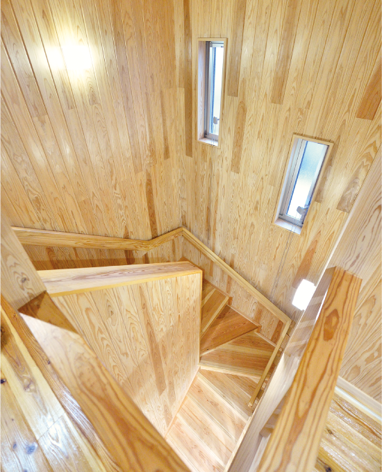 階段から壁、更には吹き抜け全体に最良の自然素材を使用。